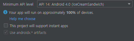 먼저 프로젝트를 만들 때 카카오 로그인 api는 SDK 버전 4.0(아이스크림 샌드위치) 이상이어야 정상 작동하므로 설정을 해줍니다.