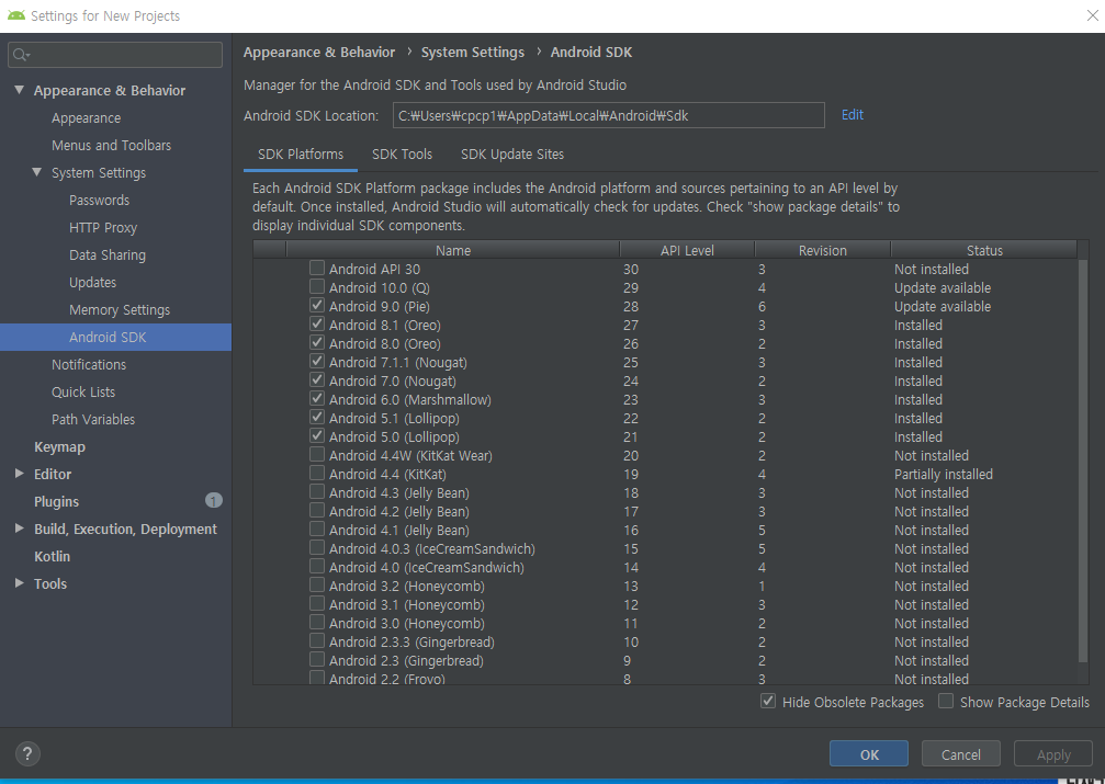 안드로이드 스튜디오의 sdk 매니저로 가신 후에 설치해주시면 됩니다.