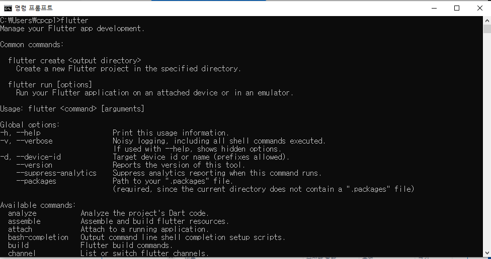 cmd 창에서 flutter을 치고 위 사진처럼 flutter 명령을 인식하면 성공!