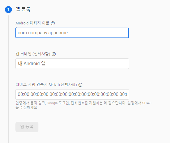 패키지 이름, 앱 이름, sha-1 인증서 등록